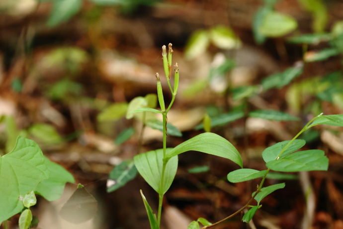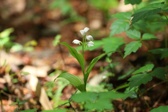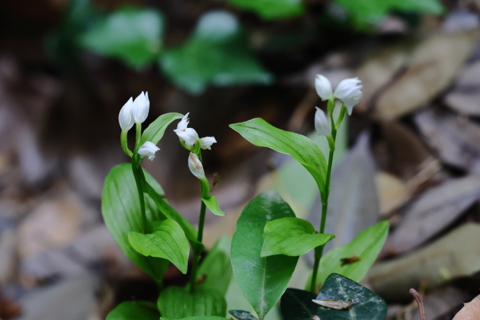 黄色の花を咲かせるキンランに対し、白い花を銀に見立てたのが名の由来です。キンランと同様に、根に共生する菌根菌からも栄養を得る部分的菌従属栄養植物です。