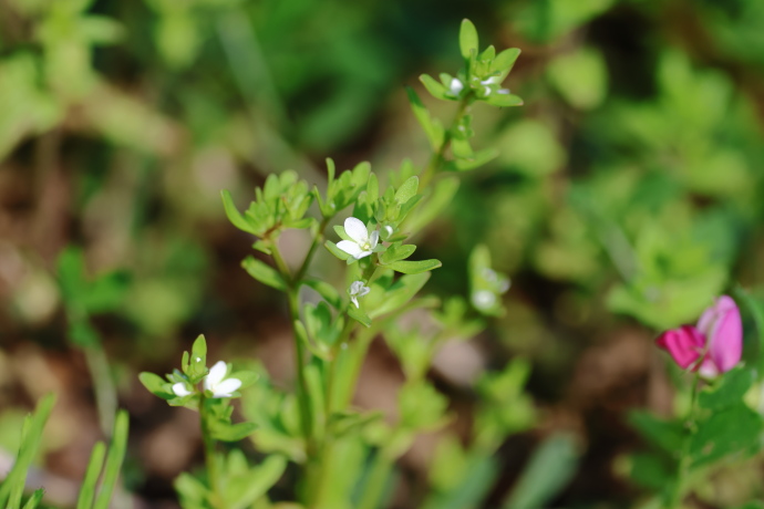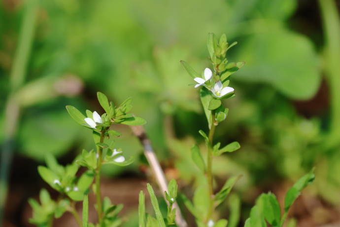 茎は下部で分枝して立ち上がり、高いものは草丈20cmほどになります。葉は対生ですが、上部では互生に見えることがあります。形は広線形または狭卵形で、縁は普通全縁です。