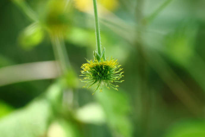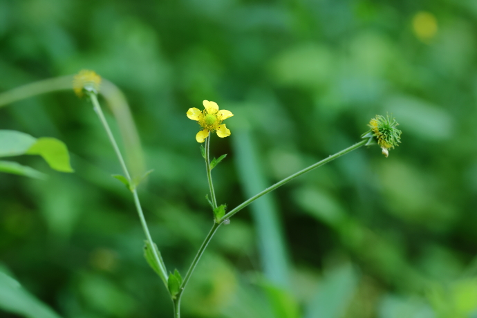 果実は痩果で球形の集合果。花柱の先はS字型で、先端が落ちると、かぎ状になって動物などに引っ掛かります。似たケキツネノボタンは花柱の先が真っ直ぐで、識別できます。
