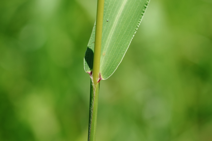 葉は線形~披針形で、毛はなく、すっきりと滑らかな印象です。基部は円形でしっかりしており、葉鞘の縁には軟毛があります。鞘口には短い毛状の葉舌が見られます。