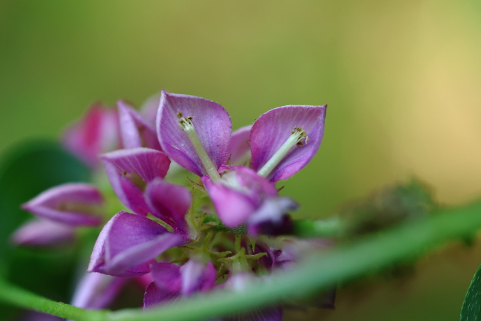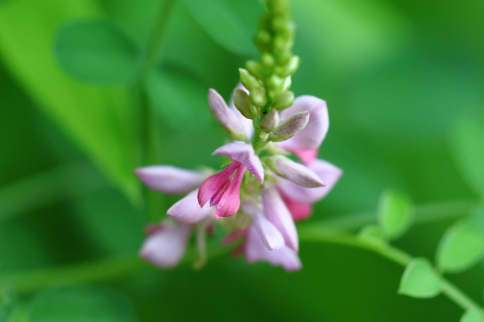 花は紅紫色の蝶型で、旗弁1枚が直立し、その下に翼弁2枚が突き出て左右に開いています。翼弁の間に竜骨弁2枚があり、合わさって雄しべと雌しべを包んでいます。