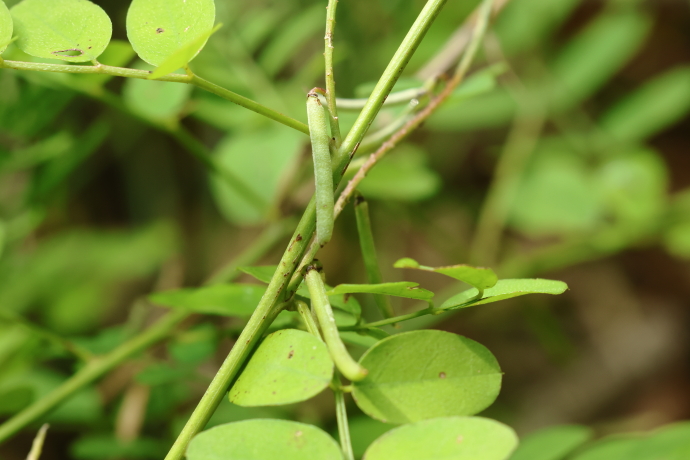 葉腋から総状花序を伸ばし、下から順に咲き上がっていきます。花序の中ほどでは開花が進み、基部側には細長い円筒形の豆果が、先端側には蕾が多数ついています。