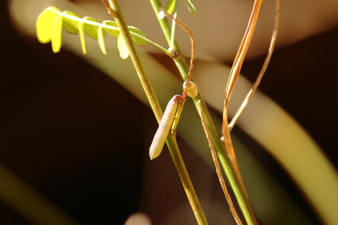 果実は円柱状の豆果で、内部には3~8個の種子が縦に並んでいます。冬にかけて熟し、莢は乾燥して硬くなります。音を立てて裂け、中の種子を弾き飛ばします。