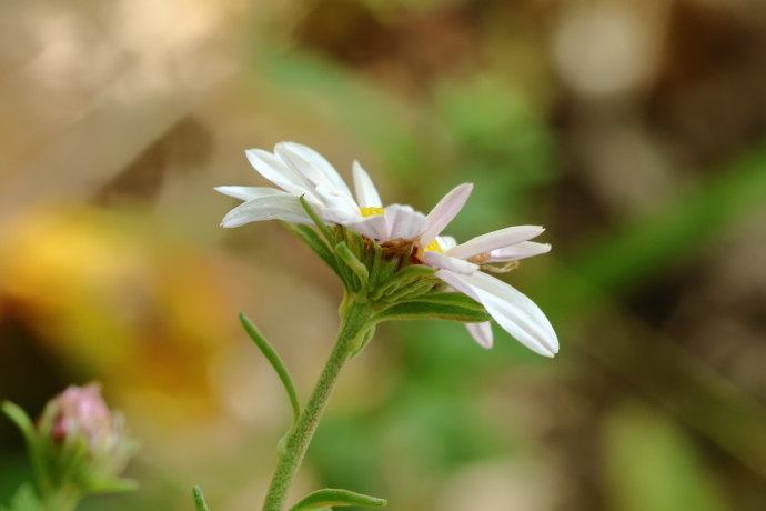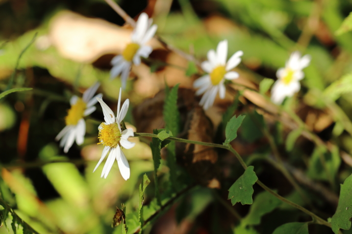 地下茎を伸ばして株立ちになり、茎を伸ばして先に頭状花を数個つけます。頭状花には、雌性で丸みを帯びた白い舌状花が並び、中央に両性の黄色い筒状花が密集します。