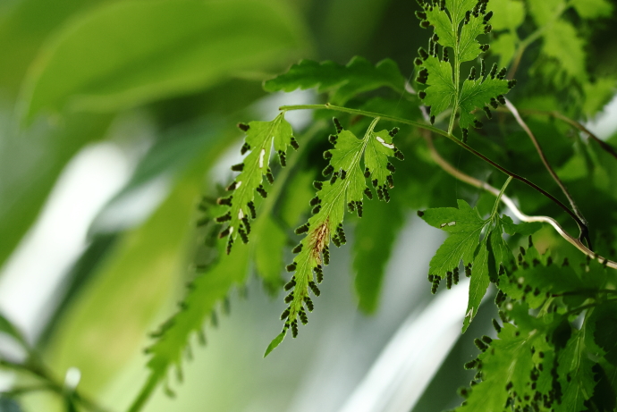 成長した胞子葉です。細かく切れ込んだ羽片の先端側や縁に胞子嚢群をつけ、胞子をつくります。葉全体が小さく分裂する場合と、一部のみが分裂する場合があります。