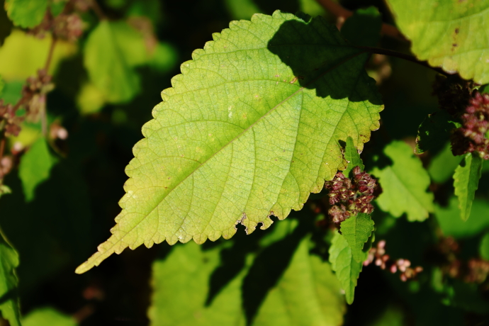 葉は互生し、広卵形で先端が鋭く尖り、縁には鈍い鋸歯が並んでいます。鋸歯の先端に側脈が1本ずつ入っており、葉の形だけでなく側脈の入り方もクワに似ています。