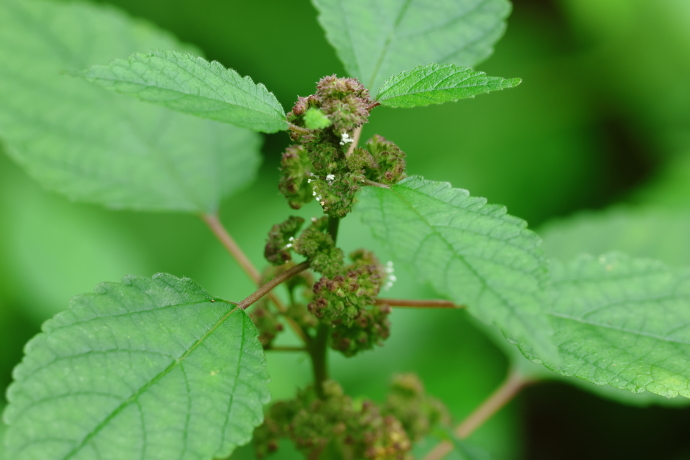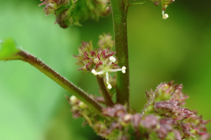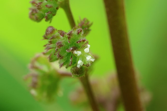 花序の中に雄花と雌花が混在します。ともに花被は4裂しています。こちらでは、花序の外側にある雄花が花被を開き、4本の雄しべをまさに立てようとしています。