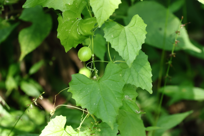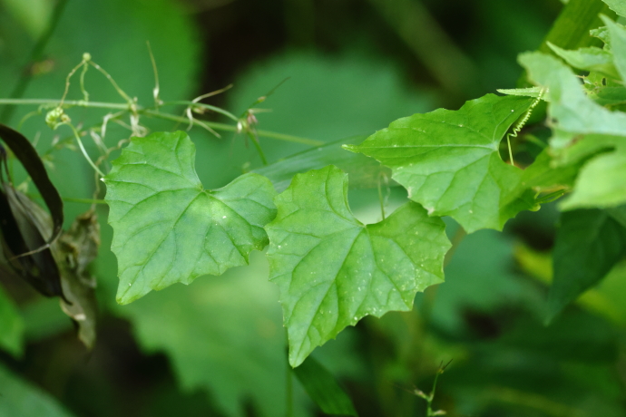 葉は互生し、三角状卵心形で浅い鋸歯が並びます。毛はなく、薄く柔らかい質感で、葉腋から巻きひげを出します。3~5浅裂葉や不分裂葉など、変異が多いようです。