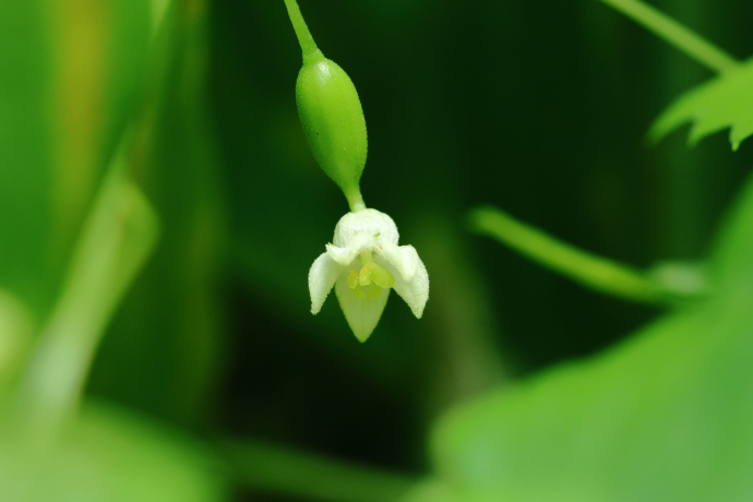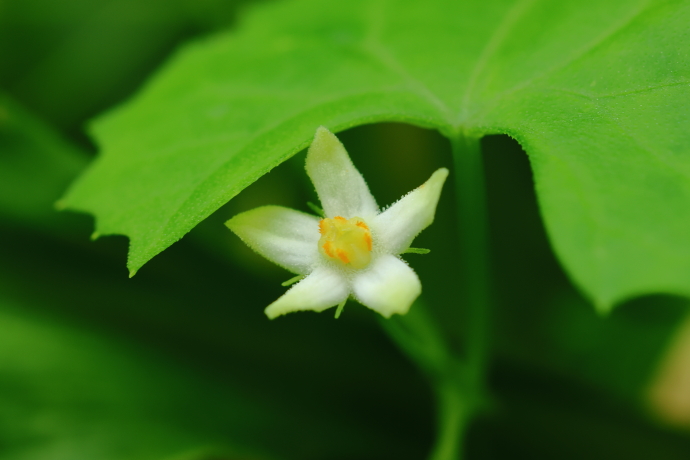 雌雄同株ですが、雌雄異株も見られます。こちらは雄花で、花冠は白い鐘形で毛があり、5深裂して上向きに咲きます。雄しべは3本が合着し、橙色の葯室を2室ずつ持ちます。