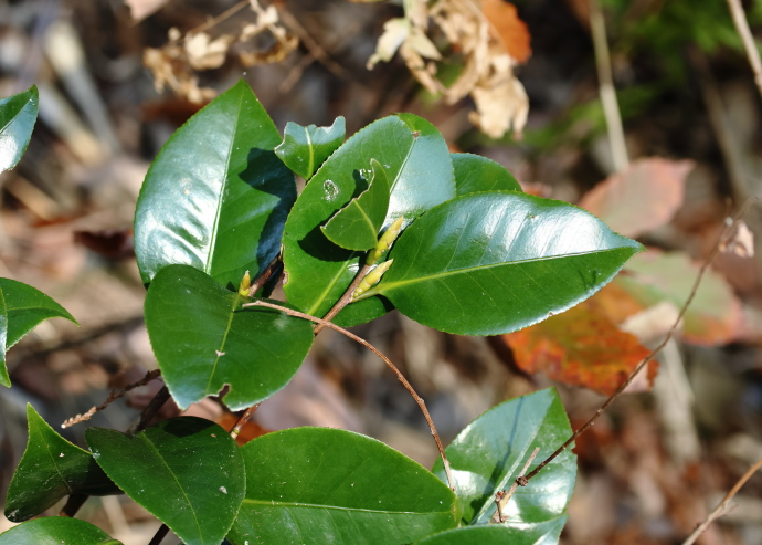 葉は互生し、長楕円形~卵状楕円形で光沢があり、縁には細かい鋸歯が並びます。クロガネモチやネズミモチなどとよく似ていますが、互生で鋸歯があるので識別できます。