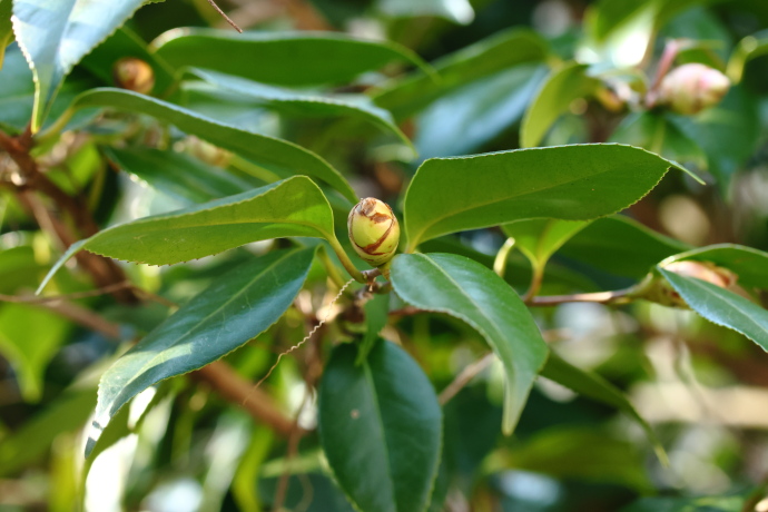 ツバキの名の由来には、厚く光沢のある葉から「艶葉木(つやはき)」や「厚葉木(あつばき)」と呼ばれた説など諸説あります。ヤブは藪に自生することに由来します。