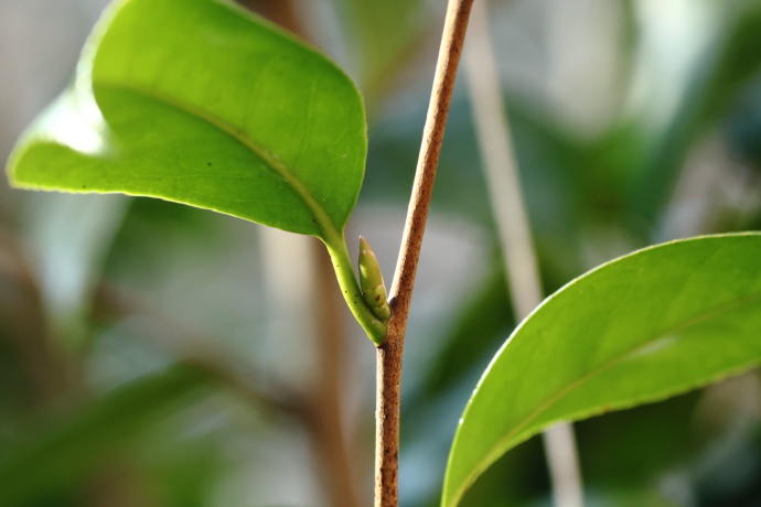 枝先に花芽がついています。卵形で丸くふくらみ、細長く尖る葉芽とは異なります。冬に咲く理由は、昆虫や鳥に目立ちやすく、他の花との競合が少ないことなどが挙げられます。