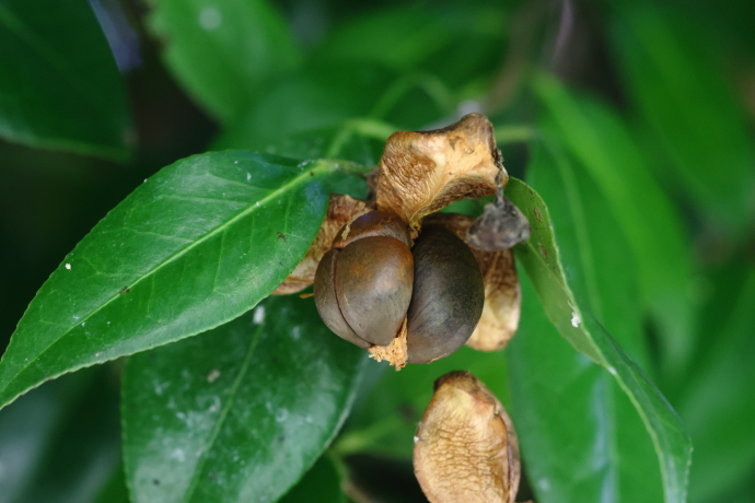 果実が付いています。果実は直径2~3cmほどの球形の蒴果です。熟すと乾いて木質化し、自然に裂開して黒褐色の種子を落とします。種子は硬く、油分を多く含みます。