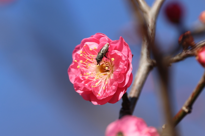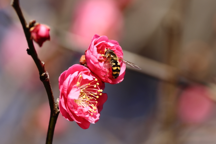 1月下旬の寒中、もうウメが開花。ウメの花には、クロヒラタアブの仲間やホソヒラタアブなどの昆虫が寄ってきました。