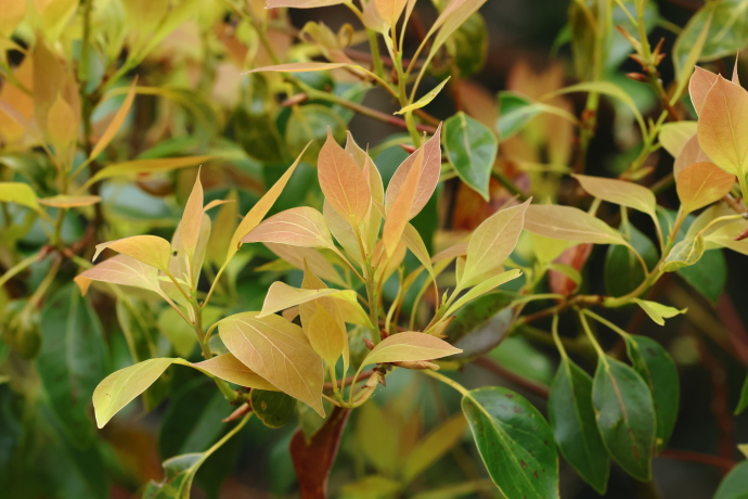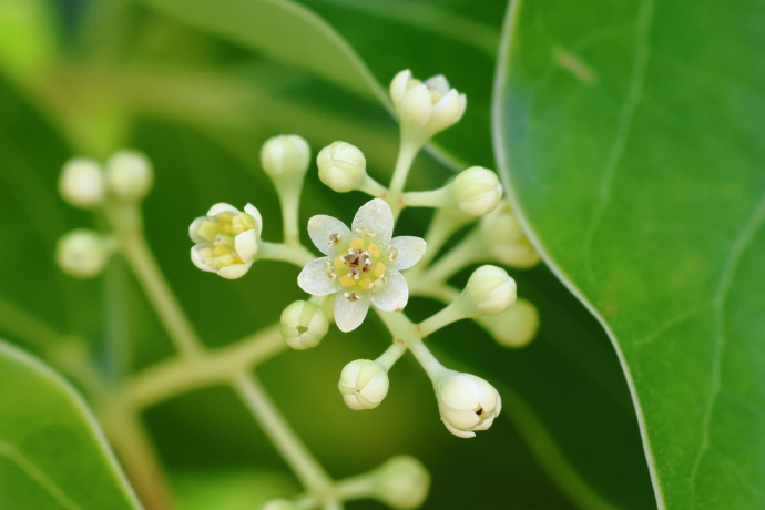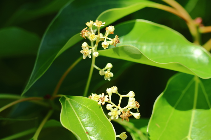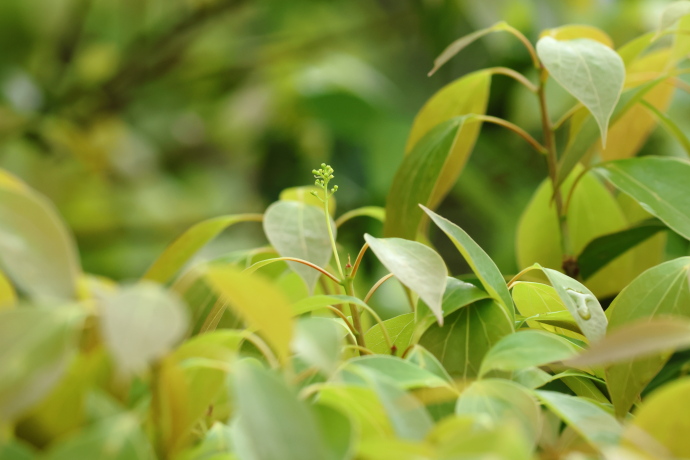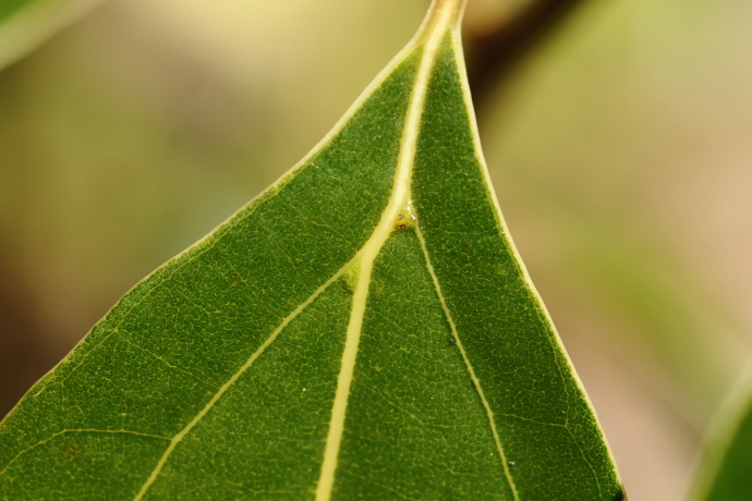 三行脈の分かれ目がこぶ状に膨らんでいるのが分かるでしょうか。ここにはダニ部屋があり、ダニを住まわせ、害虫などから葉を護っていると考えられています。