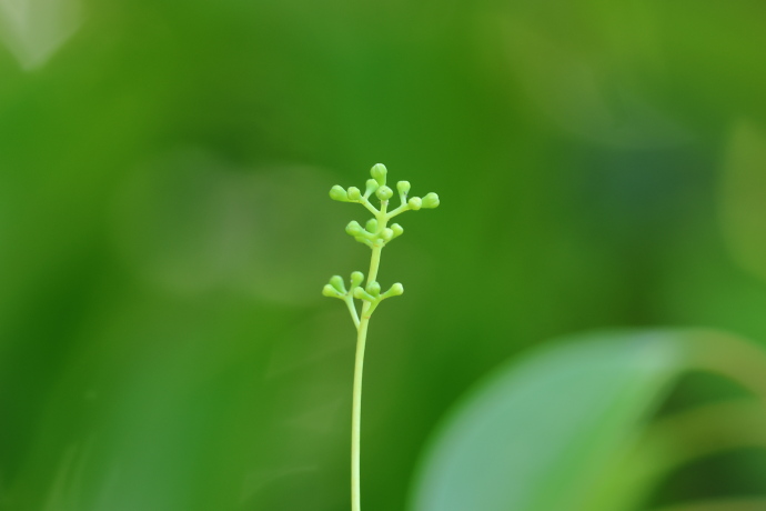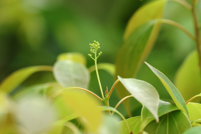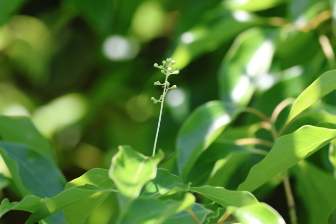 枝先の葉腋から花序が伸びています。花軸はさらに分岐し、全体として三角錐状の円錐花序をつくっています。先端には5mmほどの小さな蕾が多数つき、開花を待っています。