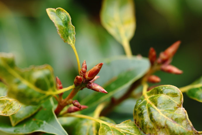 冬芽がついています。タブノキに似ていますが、茎頂に頂芽のほか、大きな頂生側芽が複数つき、葉腋にも見られます。頂芽だけが目立つタブノキとは異なります。