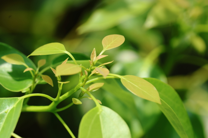 葉は互生し、楕円形~卵形で、先端は次第に尖ります。裏面は灰緑色で、縁は全縁で波打ち、革質で光沢があります。基部から三本の主脈が伸びる三行脈が際立ちます。