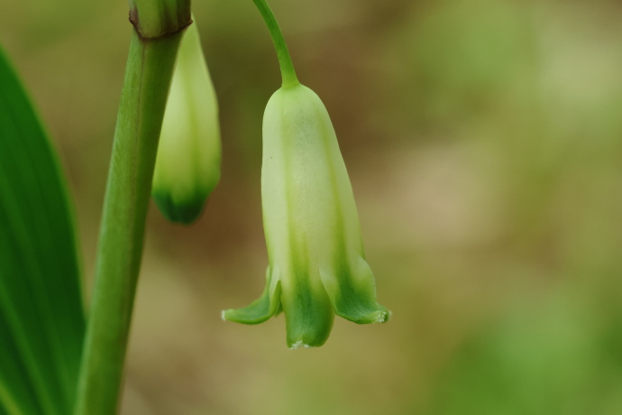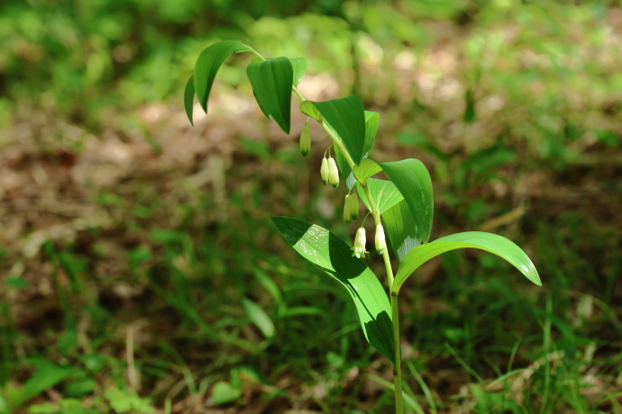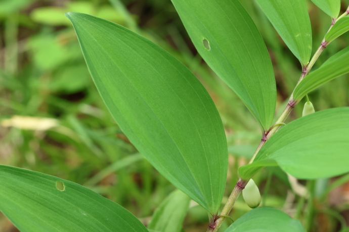 葉は楕円形でやや短く、茎には4~6本の稜があり角ばっていて、触るとやや引っかかる感触があります。ナルコユリの葉は細長く、茎は丸いので、ここでも見分けられます。