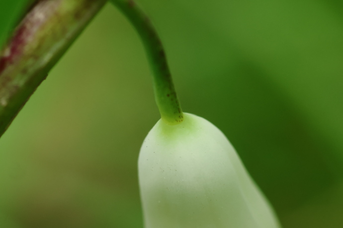 葉腋に1~2個の花をつけます。花冠は薄緑色で、花弁と萼片が筒状に合着した釣鐘型です。先端は緑色がやや濃くなり、浅く6裂し、裂片の先に毛状に見える小突起があります。