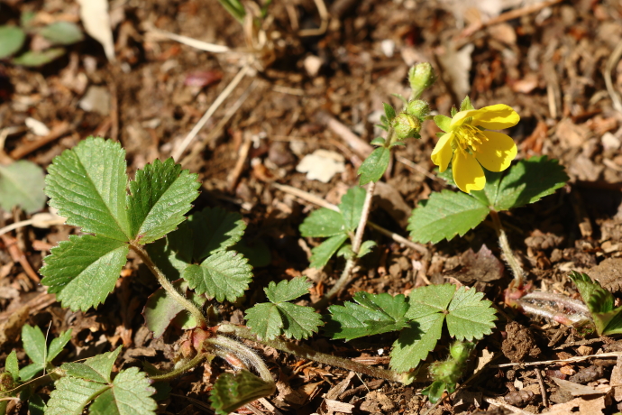 葉が大きく目立ってきました。春の芽吹きと同時に根茎から出た小さな葉は、徐々に大きくなります。走出枝を出して広がり、小型の三出複葉をつけることがあります。