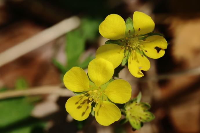 花茎を伸ばして集散状に花をつけます。花弁は黄色で5枚、雄しべ・雌しべは多数です。ヘビイチゴに似ますが、一茎に複数の花が付き、副萼片が短いため識別できます。