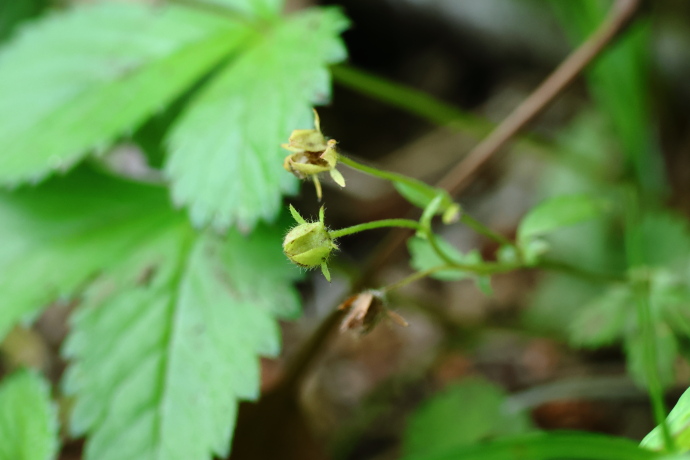 果実がついています。果実は痩果の集合果で、閉じた萼片に包まれています。熟すと少し開いたすき間から種子をこぼします。副萼片は立っていますが、萼片は平開しません。