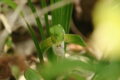 茎の一部が肥大化した丸い偽球茎が、前年の偽球茎と連なって地中で横に並び、根出状に葉を展開します。葉は約30cmと長く、幅も広めで、縦に走る葉脈がよく目立ちます。