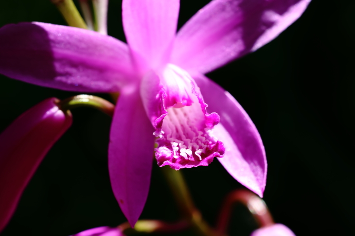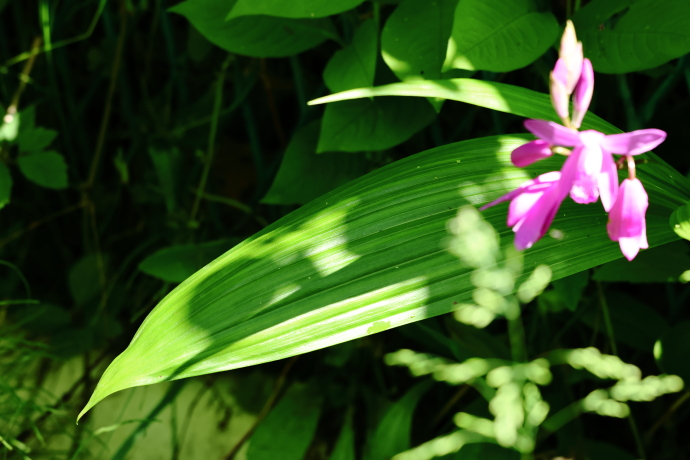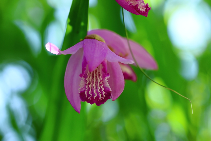 花は大型で紅紫色。外花被片が3枚、内花被片は左右上方に側弁2枚、正面に唇弁1枚。唇弁にはヒダ状の隆起線が5列あり、その上に雄しべと雌しべが合着した蕊柱が見られます。