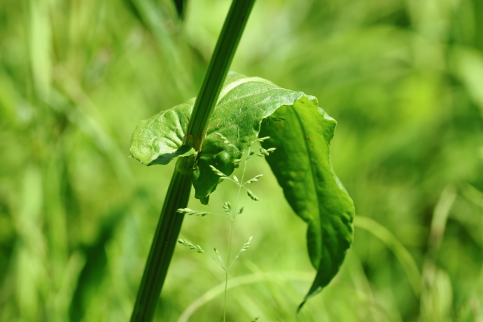 茎は直立し、中頃から上部の葉はほとんど無柄で互生し、茎を巻いています。葉の基部は三角状の矢じり型で、楕円形をしたギシギシとの識別に役立ちます。