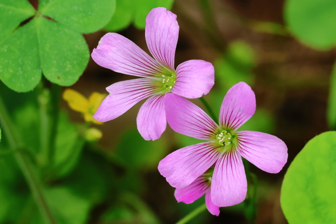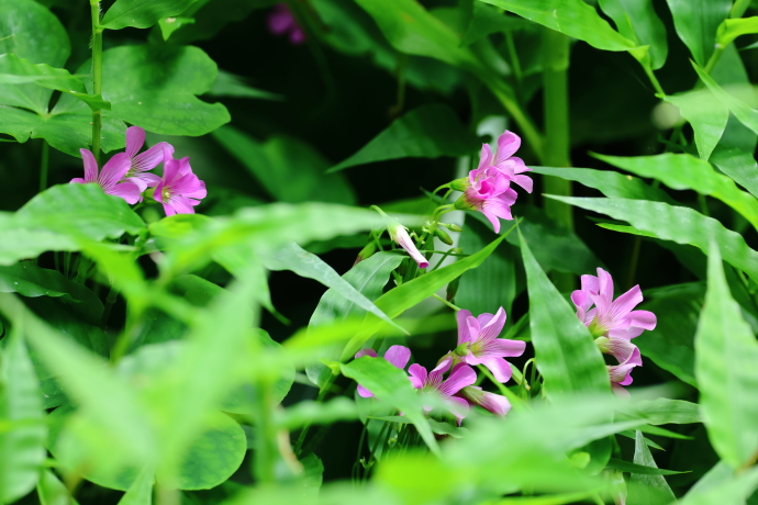 江戸時代に観賞用として移入された南アメリカ原産の帰化植物。花弁が紅紫色で、一見イモカタバミのように見えますが、花期が遅く、花冠の中心が白~緑色と異なります。