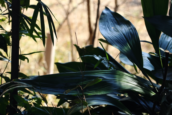半日陰を好み、葉は深い緑色で、50cmを超えるほどに大きく、硬くてつやがあります。葉姿の美しさを楽しむ植物として改良され、今では斑入りなど多くの園芸種が出ています。