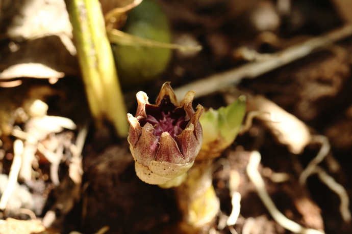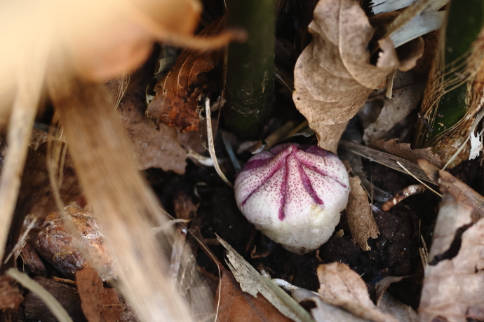 蕾が枯れ葉の隙間から顔を出しています。しっかりと閉じていてキノコのようですが、多肉質で、触ると硬い質感です。地下茎の鱗片葉の腋から花茎を出し、先端に花をつけます。