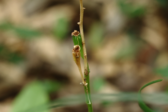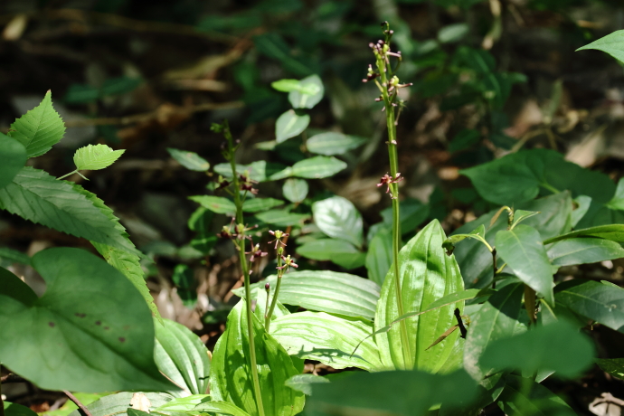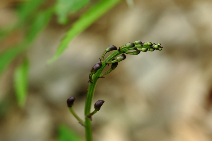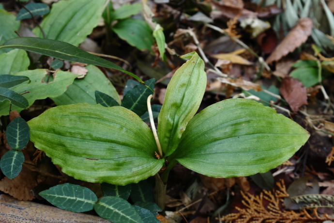 暗い林床に生育します。細長い円筒形の偽球茎の先から、2~3枚の葉を出します。葉間が狭く、互生ですが対生のように見えます。葉の基部にある葉鞘で偽球茎を包みます。