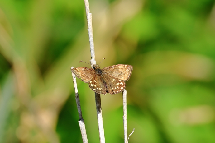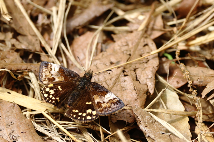 翅を開いて止まり、翅裏はなかなか見せてくれません。翅裏は表面とほぼ同じ茶褐色で、後翅には白黄斑が見えます。全体に枯葉や樹皮になじみ、保護色となっています。