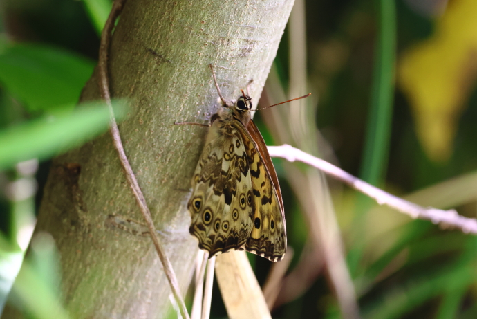 褐色地に斑模様と眼状紋が並びます。ヤマキマダラヒカゲと酷似しますが、後翅の上から3、4つ目の眼状紋の黒目が小さく、付根の3つの丸い斑紋が直線的なため、サトとしました。
