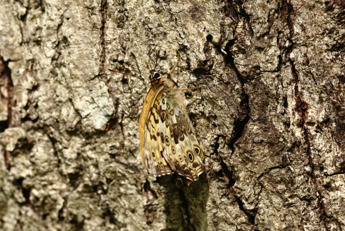 近寄るとクヌギの幹に飛び移りました。翅裏の茶褐色地の斑模様が樹皮の色彩に紛れ、危うく見失うところでした。改めて見ても居場所が分かりにくく、見事な擬態です。