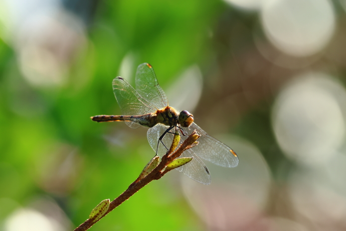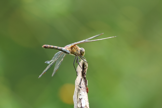 メスに出会いました。周囲にはアキアカネも多数いますが、識別に迷います。本種は胸部側面の2本の黒条が離れ、頭部側の黒条は途中で断ち切られたような形になります。