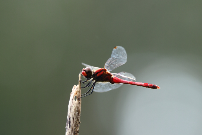 オスは頭部・胸部・腹部の全身が赤くなります。よく似たアキアカネは腹部だけが赤く、飛んでいても分かります。胸部側面の黒条での識別は、飛翔中は困難です。