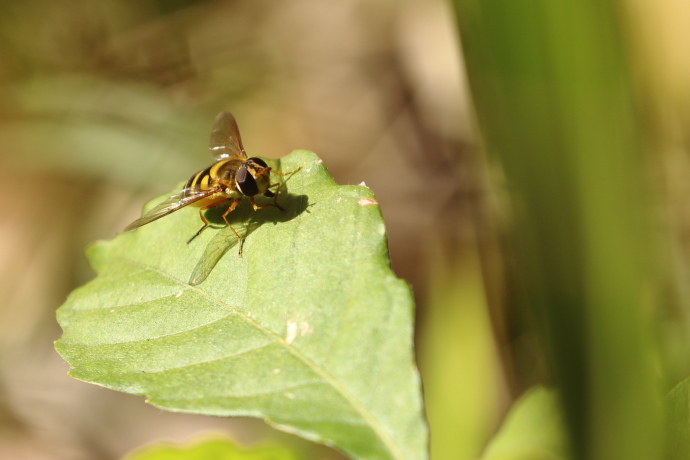 腹部の黄色い帯紋は1本目だけが分断しています。ナミホシヒラタアブ、フタホシヒラタアブ、マガイヒラタアブ、ケヒラタアブなど、本種と似ている種は実に多数あります。