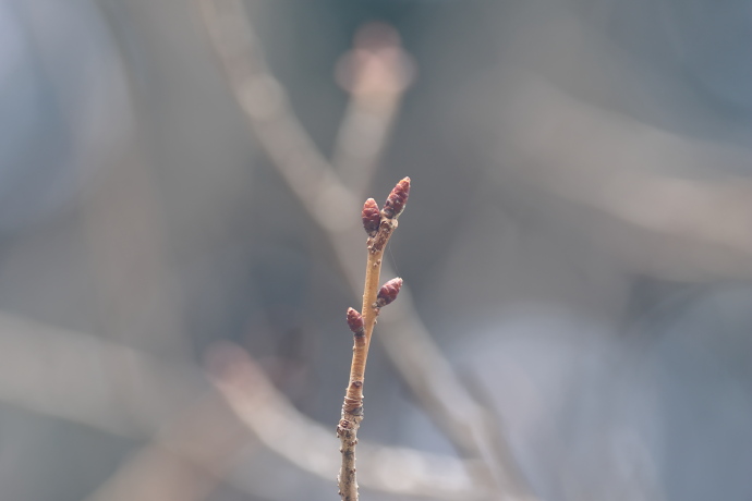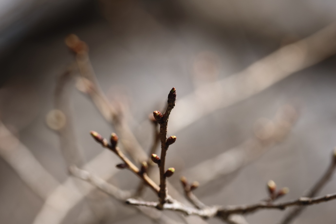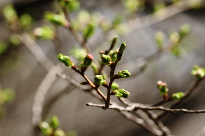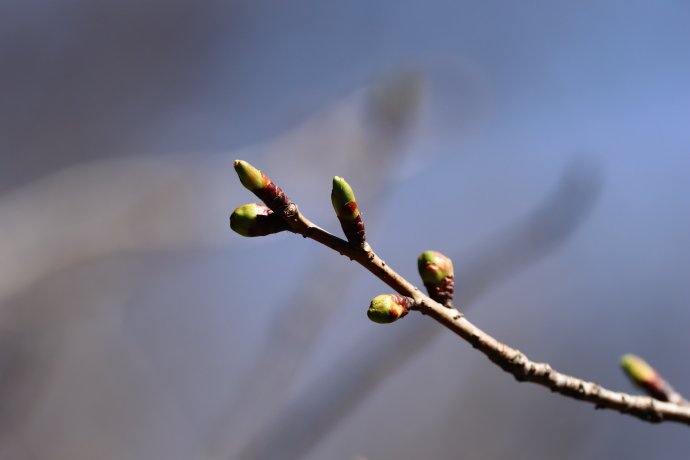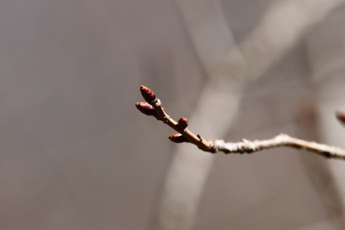 冬芽は赤褐色で、芽鱗は10枚ほど見えています。芽鱗の数は多く、無毛でツヤがあり、ヤマザクラとは異なり開いたようにはなりません。やや細長く、冬芽は葉芽です。