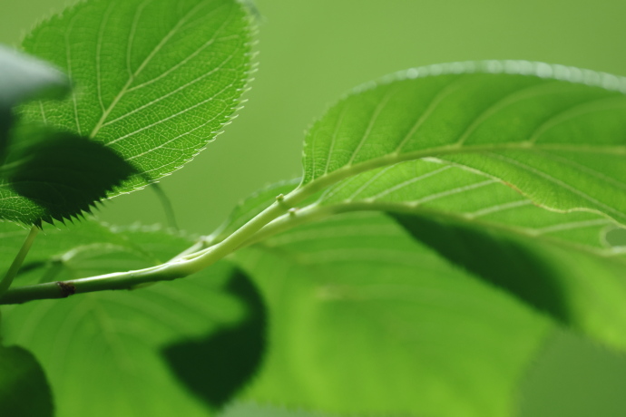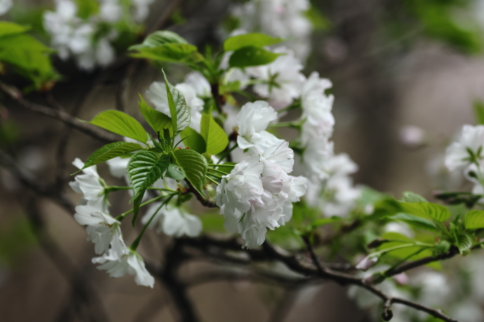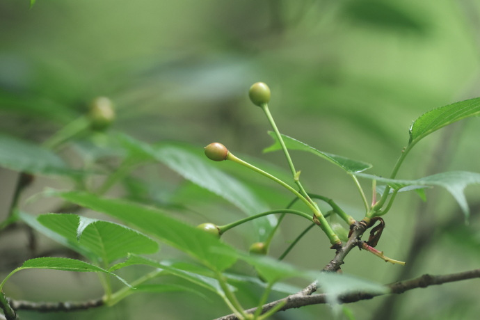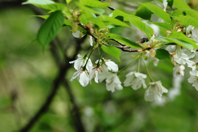 サクラの仲間は葉柄~葉の基部に蜜腺があります。本種の蜜腺は、葉柄の上部で葉身基部から少し離れたところにつきます。蜜腺の位置は、識別の手がかりになります。