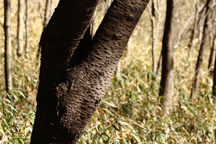 サクラの仲間の樹皮には横長の筋が出ます。本種の筋は細くて短く、あまりゴツゴツしていない印象です。こちらは暗灰褐色ですが、暗灰色や暗灰紫色に見えるものもあります。