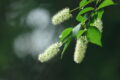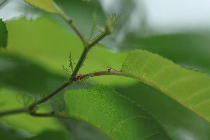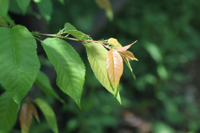 葉は互生し、長楕円形で葉先は細く尾状に伸びます。縁には重鋸歯が並びます。若葉が赤みを帯びるのが本種の特徴で、基部側の葉と美しいグラデーションを作っています。