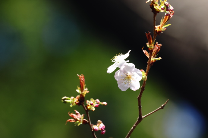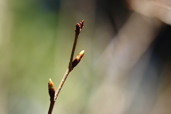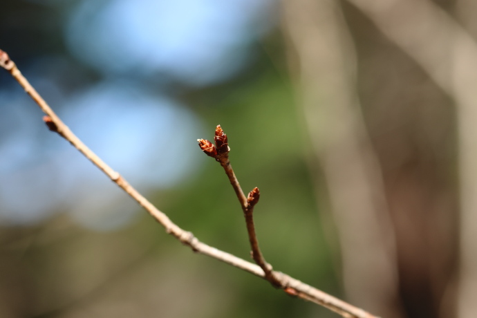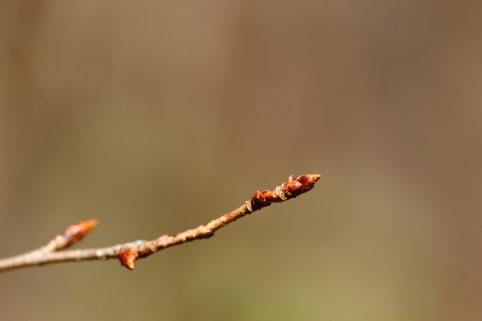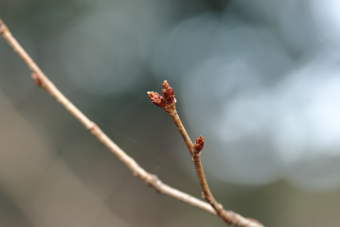 冬芽は赤褐色で、芽鱗は無毛で8枚ほど見えます。芽鱗が少し開くのが本種の特徴です。サクラの仲間の冬芽は花芽と葉芽に分かれ、新枝の葉腋に花芽を付けます。