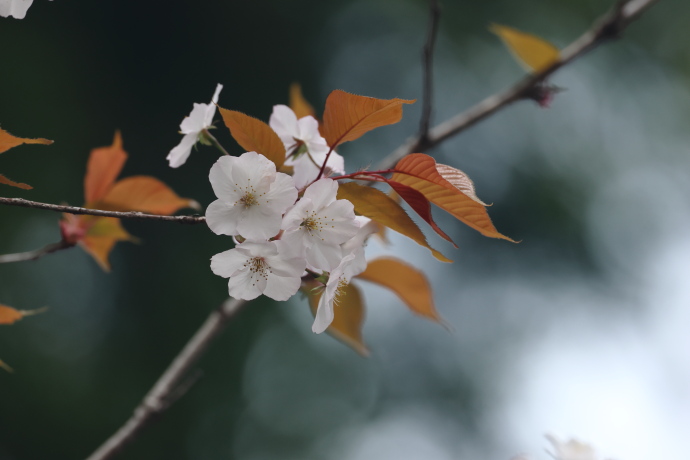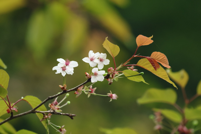 花芽と葉芽はほぼ同時に展開します。若葉は赤みを帯びます。花弁は白色で5枚、雄しべ多数、雌しべ1本です。萼筒は細く無毛で、小花柄も無毛、萼片に鋸歯はありません。