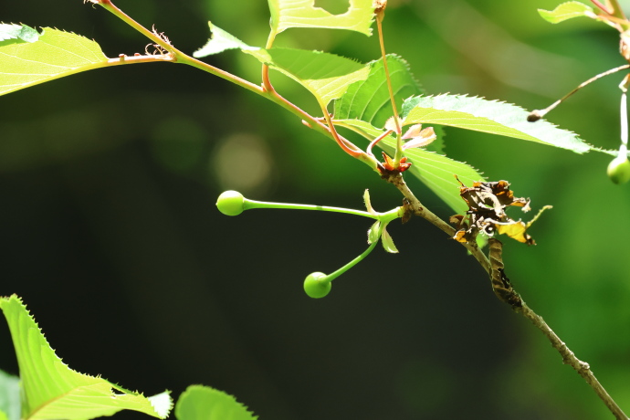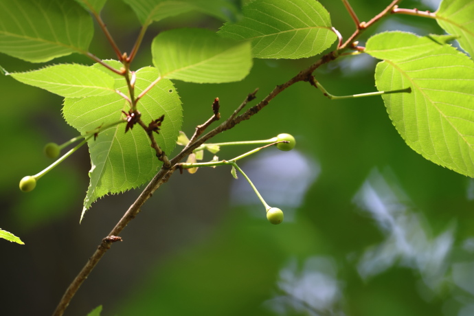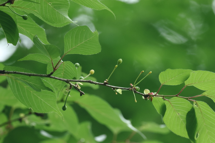 サクラの仲間には葉柄から葉の基部に蜜腺があります。本種は葉柄の上部で、葉身の基部から少し離れたところにつきます。蜜腺の位置は識別の手がかりになります。