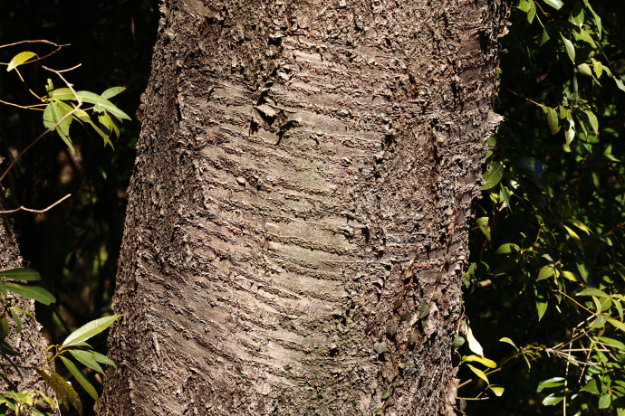 樹皮にも特徴があります。サクラの仲間は横長の筋が出ますが、本種はその筋が特に目立ちます。暗褐色に見えますが、暗灰色や暗紫褐色に見えるものもあります。