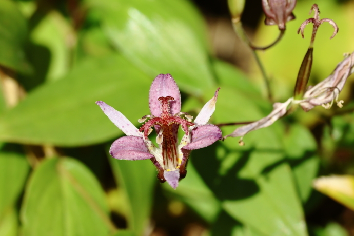 花が咲いています。花被片は淡い紅紫色で、内花被片3枚と外花被片3枚があり、ラッパ状に斜開し、内側には紅紫色の斑点が見られます。幅広く色の濃いものが外花被片です。