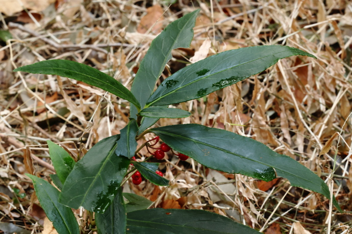 花が「橘」に似て、「唐」渡来と誤認されたことから名が付きました。縁起物として、江戸時代には「百両」と呼ばれました。葉は互生し、縁に波状の鋸歯があり、先は尖ります。